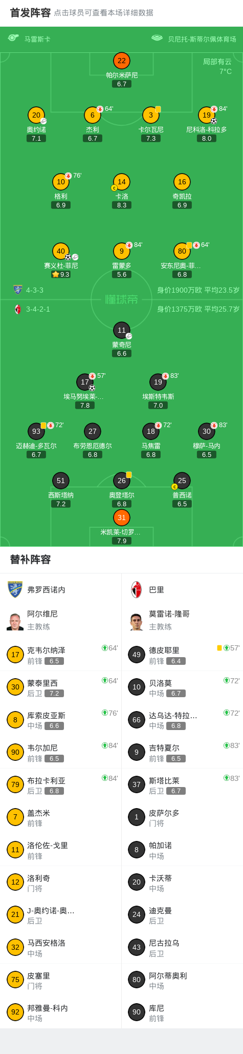 弗罗西诺内2-1逆转巴里,尼科洛-科拉多破门,赛义杜-菲尼1传1射