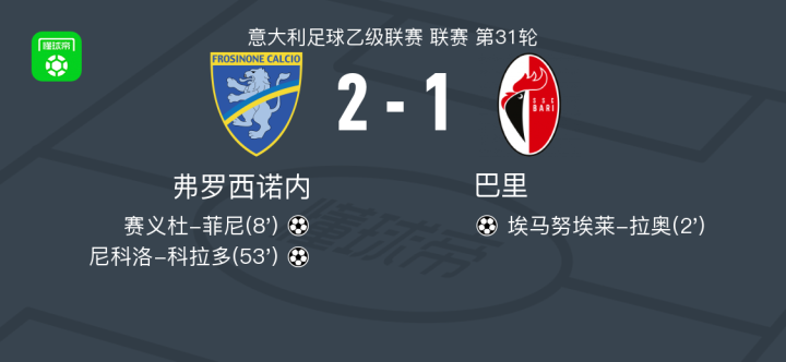 北京时间3月19日意大利足球乙级联赛 联赛 第31轮,弗罗西诺内主场对阵巴里。弗罗西诺内赛义杜-菲尼破门,尼科洛-科拉多破门。巴里埃马努埃莱-拉奥破门。最终比分弗罗西诺内 2-1 巴里。