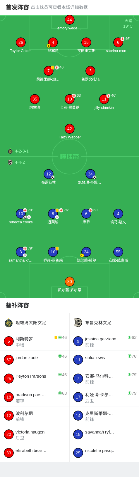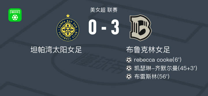 北京时间3月19日美女超 联赛,坦帕湾太阳女足对阵布鲁克林女足。布鲁克林女足rebecca cooke破门,凯瑟琳-齐默尔曼破门,布雷斯林破门。最终比分坦帕湾太阳女足 0-3 布鲁克林女足。