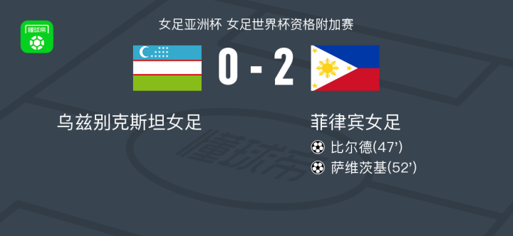 北京时间3月19日女足亚洲杯 女足世界杯资格附加赛,乌兹别克斯坦女足对阵菲律宾女足。菲律宾女足比尔德破门,萨维茨基破门。最终比分乌兹别克斯坦女足 0-2 菲律宾女足。