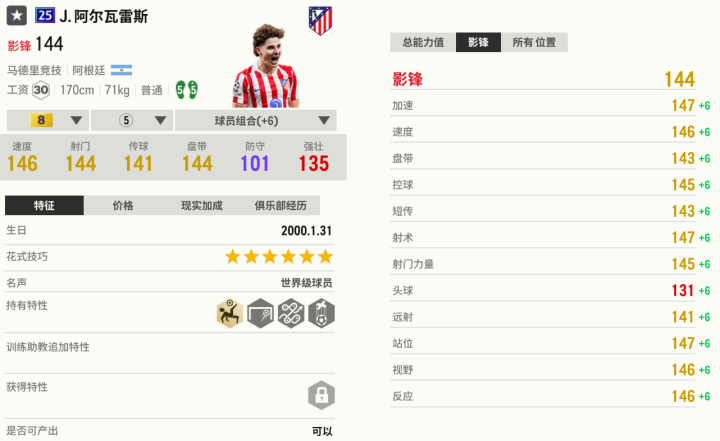 随着之后OVR的上调,25U赛季要超越26TY赛季,成为阿尔瓦雷斯最好的选择。马竞套和阿根廷套里,这张25U阿尔瓦雷斯是绝对的首发之一。