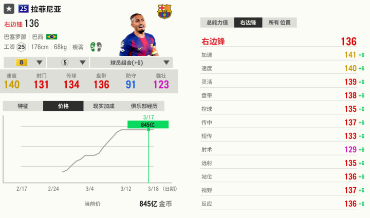 拉菲尼亚的强力赛季有26TY和25TS,这张25U赛季有很大差距。但随着此役的超级发挥,25U很有可能迎来OVR的大幅上涨,应该能迫近FAC赛季了。25U是拉菲尼亚首个装备了金特性的赛季,等他的OVR增长后,就可以使用25U来感受“闪电突破”的效果。