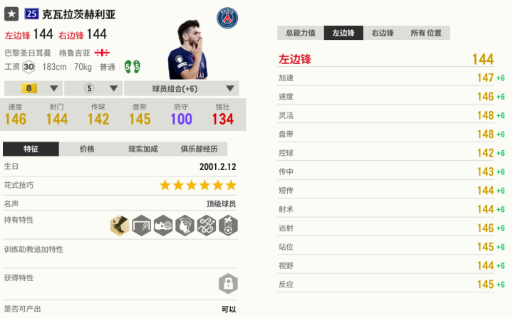 克瓦拉茨赫利亚在25U赛季迎来了自己的首张金特性卡,携带了“闪电突破”的克瓦拉茨赫利亚,在带球和后卫单挑时,增加了过人的方式,可以依靠“闪电突破”带来的速率差“强吃”对手。随着以后涨能力,25U这张卡能成为K77的首选,在巴黎套里担任主力左边锋。