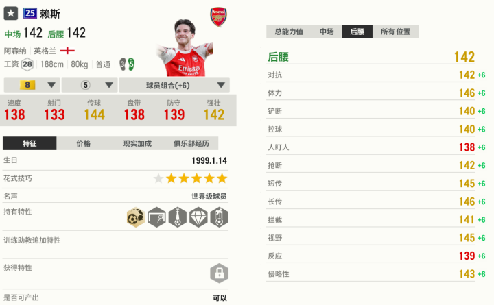赖斯的25U赛季是26TY的低配置版,从身高体重到金特性,二者非常相似。因此,25U赛季很适合购买不起26TY赛季的平民玩家,这张25U也有很准确的传球和势大力沉的远射,他的防守效果不错,作为主力也是合格的。