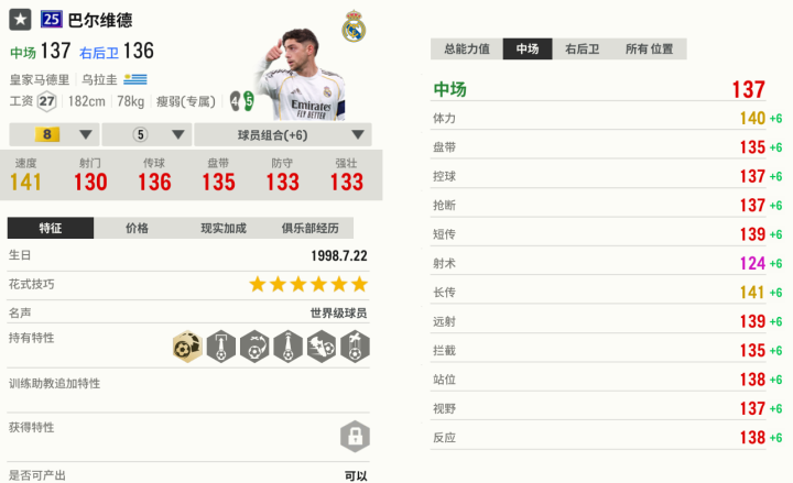 25U巴尔维德装备了“精准输送”的金特性,在发起过顶直传时能够提升成功率,有利于快速进攻的实现。25U巴尔维德还有“传球大师”特性,他的直塞成功率比其他赛季高一些。除了传球,他还有重炮射门,这是巴尔维德各赛季都具备的优点。
