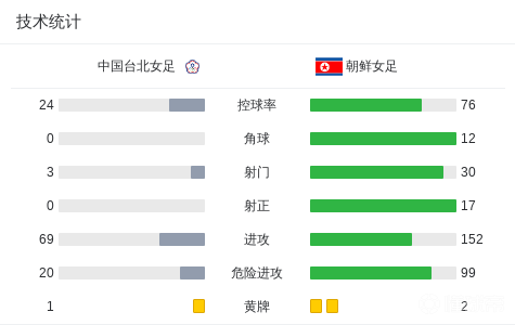 北京时间3月19日女足亚洲杯 女足世界杯资格附加赛,中国台北女足对阵朝鲜女足。上半场金景英传中,洪成玉头球破门。下半场崔一善传中,洪成玉头球双响,随后全龙钟传中,金景英头球破门,之后洪成玉补射破门上演帽子戏法。最终朝鲜女足4-0中国台北女足晋级世界杯,后者进入洲际附加赛。