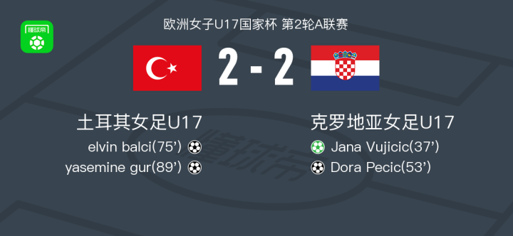 北京时间3月19日欧洲女子U17国家杯 第2轮A联赛,土耳其女足U17对阵克罗地亚女足U17。土耳其女足U17elvin balci破门,yasemine gur破门。克罗地亚女足U17Jana Vujicic破门,Dora Pecic破门。最终比分土耳其女足U17 2-2 克罗地亚女足U17。