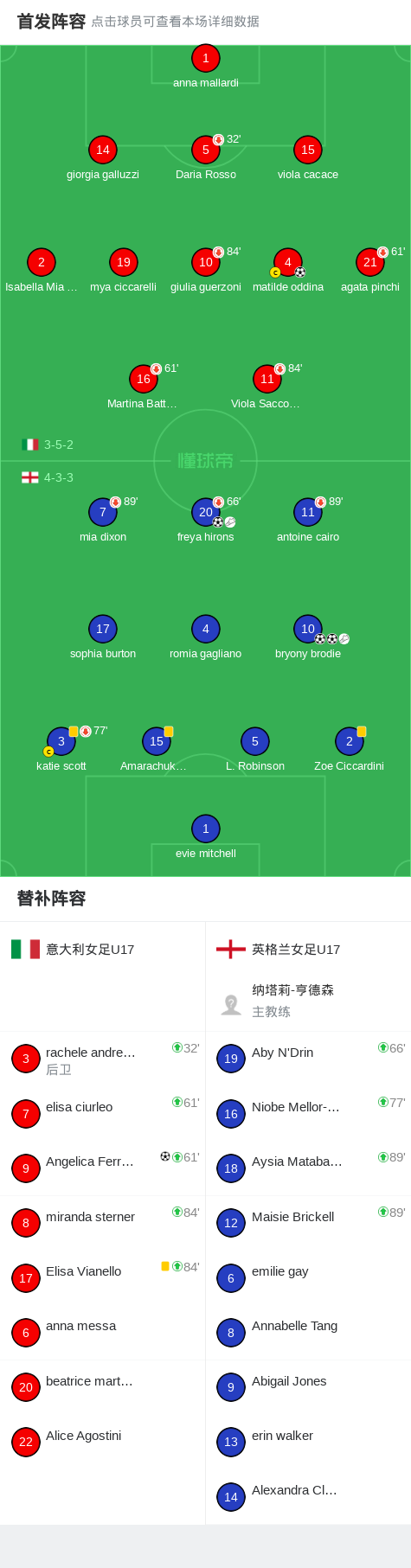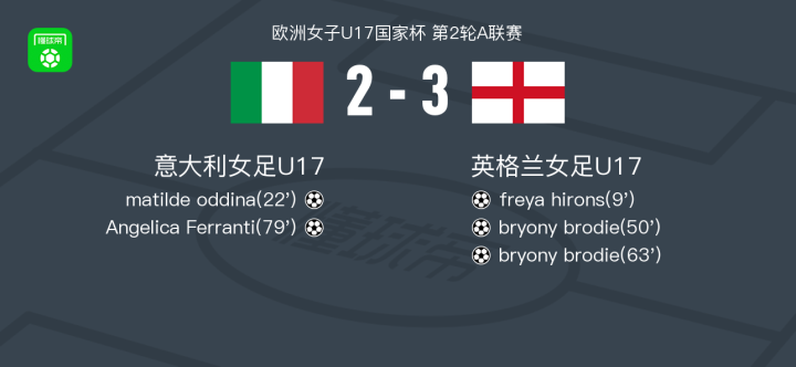 北京时间3月19日欧洲女子U17国家杯 第2轮A联赛,意大利女足U17对阵英格兰女足U17。意大利女足U17matilde oddina破门,Angelica Ferranti破门。英格兰女足U17freya hirons破门,bryony brodie梅开二度。最终比分意大利女足U17 2-3 英格兰女足U17。