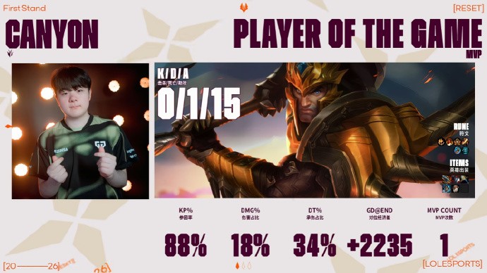 北京时间3月19日,2026全球先锋赛第四日,GEN同样3-0战胜LYON,继BLG后第二个晋级淘汰赛。