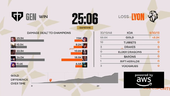 Canyon本局非常活跃,在中路反蹲成功,GEN下路也打出线杀。此后LYON几波团战强冲Ruler拿到了一些人头,但双方差距还是太过巨大,GEN拿下小龙又打出团灭后拿下了第一局的胜利!