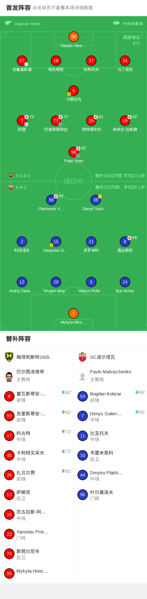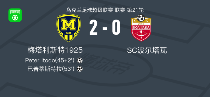 北京时间3月20日乌克兰足球超级联赛 联赛 第21轮,梅塔利斯特1925主场对阵SC波尔塔瓦。梅塔利斯特1925Peter Itodo破门,巴普蒂斯特拉破门。最终比分梅塔利斯特1925 2-0 SC波尔塔瓦。
