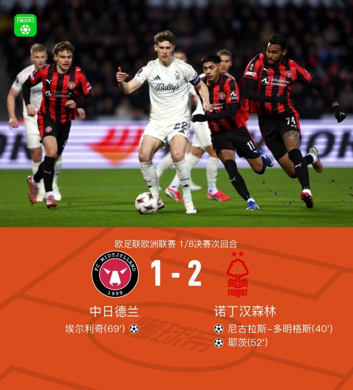 北京时间3月20日欧足联欧洲联赛 1/8决赛次回合,中日德兰对阵诺丁汉森林。中日德兰埃尔利奇破门。诺丁汉森林尼古拉斯-多明格斯破门,耶茨破门。最终比分中日德兰 1-2 诺丁汉森林。两回合总比分中日德兰2-2诺丁汉森林。