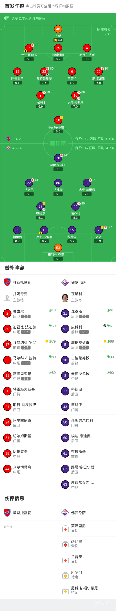 北京时间3月20日欧洲协会联赛 1/8决赛次回合,琴斯托霍瓦对阵佛罗伦萨。上半场斯特鲁斯基首开记录下半场恩杜尔射门皮球碰到皮科利折射入网,补时阶段庞格拉契奇超远距离破门锁定胜局。最终比分琴斯托霍瓦 1-2 佛罗伦萨。两回合总比分琴斯托霍瓦2-4佛罗伦萨。