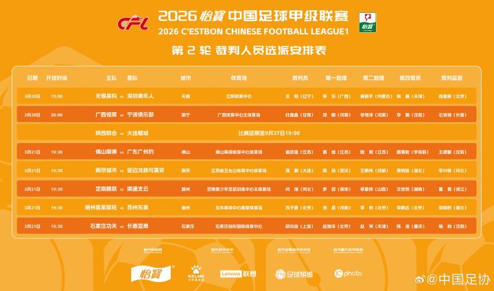 北京时间3月20日,中甲第2轮裁判名单公布,崔跃强执法佛山南狮vs广东广州豹,高鹏执法南京城市vs延边龙鼎。