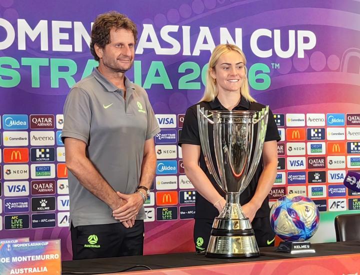 北京时间3月20日,女足亚洲杯决赛赛前新闻发布会在悉尼的澳大利亚体育场进行。澳大利亚女足主教练蒙特穆罗携球员卡彭特出席。