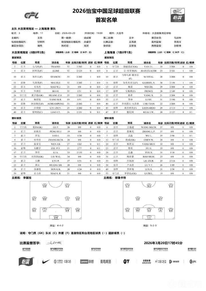 北京时间3月20日19:00,中超第3轮展开争夺,上海海港做客大连梭鱼湾足球场挑战大连英博,本场主裁判为王竞,VAR裁判为甘树然,赛前双方首发出炉。