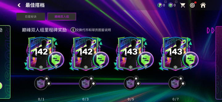 累计兑换奖励达到对应次数后,可以解锁巅峰双人组里程碑奖励。里程碑奖励中,玩家可以解锁两项142能力值最佳搭档球员专属交换、两项143能力值最佳搭档球员专属交换。每次完成交换,除了获得对应能力值球员卡奖励,还能获得一枚最佳搭档交换代币。