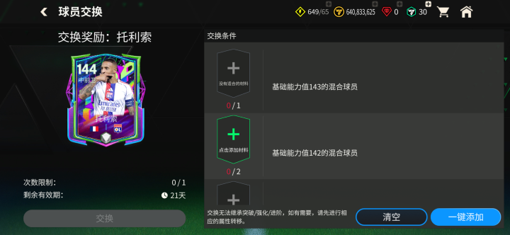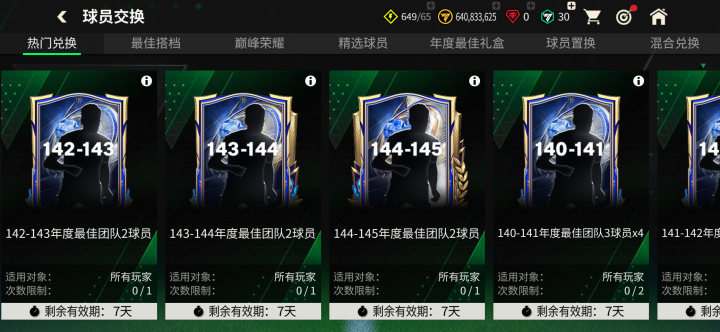 参与这些交换,均需要使用1张143能力值混合球员、2张142能力值混合球员、1枚最佳搭档交换代币。