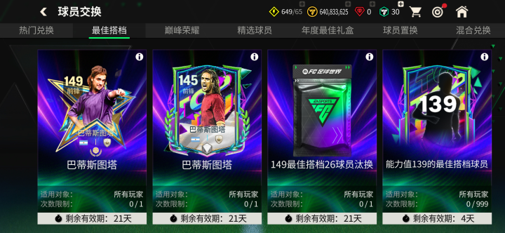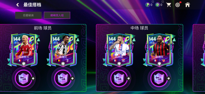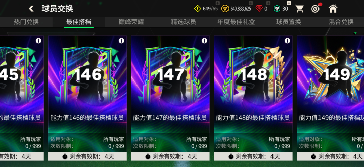 最佳搭档球员 团队在本周四更新后上线,参与球员交换可以获得139-149能力值巅峰荣耀球员卡。
