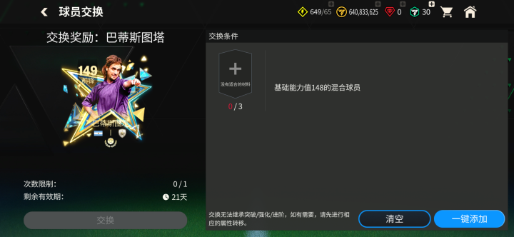 在球员交换部分,玩家同样可以参与仅限一次的149能力值最佳搭档球员汰换。使用1张149能力值最佳搭档球员卡、1张146能力值混合球员卡,可以交换获得3张148能力值混合球员卡。