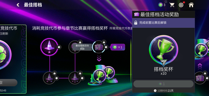 参与章节内赛事,可以解锁最佳搭档活动奖励,将最佳搭档竞技代币,兑换为搭档奖杯。搭档奖杯是用于巅峰双人组章节兑换奖励的重要代币。