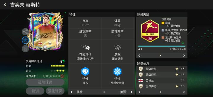 实战中,赫斯特能突擅射,是一名持球进攻能力和无球终结能力俱佳的全能前锋。得分方面,赫斯特花式后的衔接搓射以及禁区外远距离爆射表现俱佳,虽然身高一般,但他对传球的落点判断准确,具备不错的头球冲顶能力。跑位方面,赫斯特的活跃区域保持在对方半场中路,比赛中的回撤比较少,前场存在感稳定。不过赫斯特的花式星级只有三星,无法使用目前游戏内比较强势的脚后跟磕球花式,因此,玩家要减少一对一时的速度强突,避免失误。