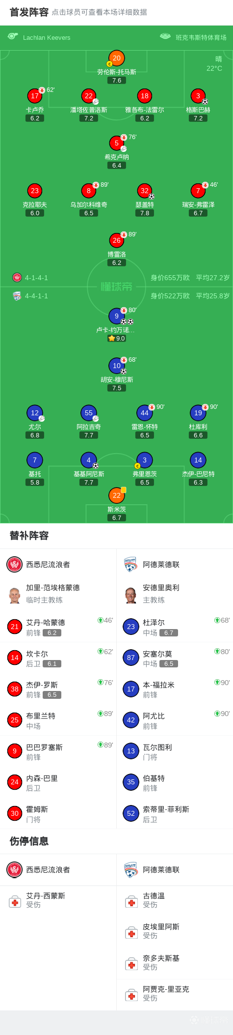 第22分钟,卢卡-伊万诺维奇禁区内拿球转身射门扳平比分,阿德莱德联1-1