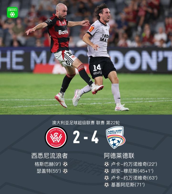 北京时间3月20日澳大利亚足球超级联赛第22轮,西悉尼流浪者主场对阵阿德莱德联。比赛中,西悉尼流浪者率先由格斯巴赫破门,随后阿德莱德联卢卡-约万诺维奇打入扳平进球,上半场补时阶段,阿德莱德联再由胡安-穆尼斯破门反超比分;下半场,西悉尼流浪者瑟盖特打入进球将比分追近,但阿德莱德联随后由卢卡-约万诺维奇再入一球完成梅开二度,之后基基阿尼斯也打入进球锁定胜局。最终比分西悉尼流浪者2-4阿德莱德联。