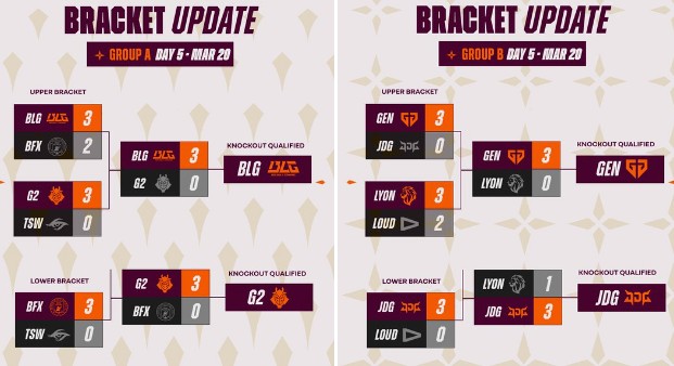 LPL和LCK赛区的1号种子BLG和GEN均是两连胜成功晋级,G2则是在首战取胜后输给了BLG,但在昨晚多少有点出人意料地3-0击败LCK的2号种子BFX晋级,JDG则是首战0-3脆败给GEN后及时调整,连胜两场也成功晋级。