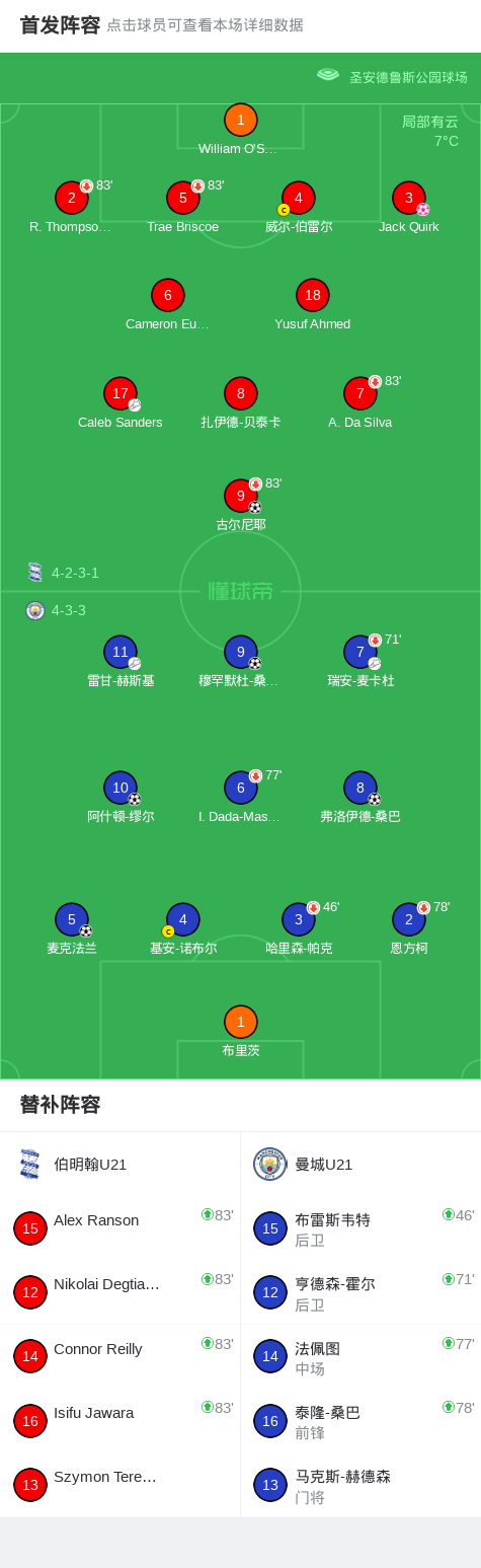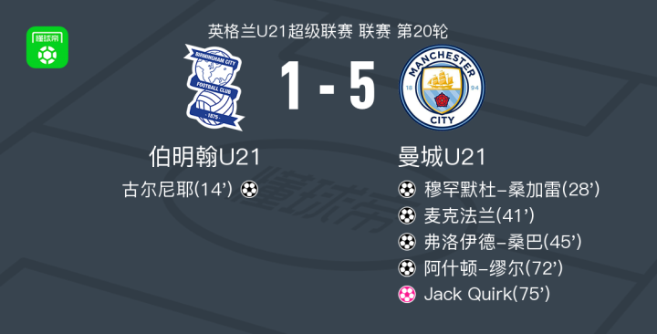 北京时间3月21日英格兰U21超级联赛 联赛 第20轮,伯明翰U21主场对阵曼城U21。伯明翰U21古尔尼耶破门,Jack Quirk自摆乌龙。曼城U21穆罕默杜-桑加雷破门,麦克法兰破门,弗洛伊德-桑巴破门,阿什顿-缪尔破门。最终比分伯明翰U21 1-5 曼城U21。