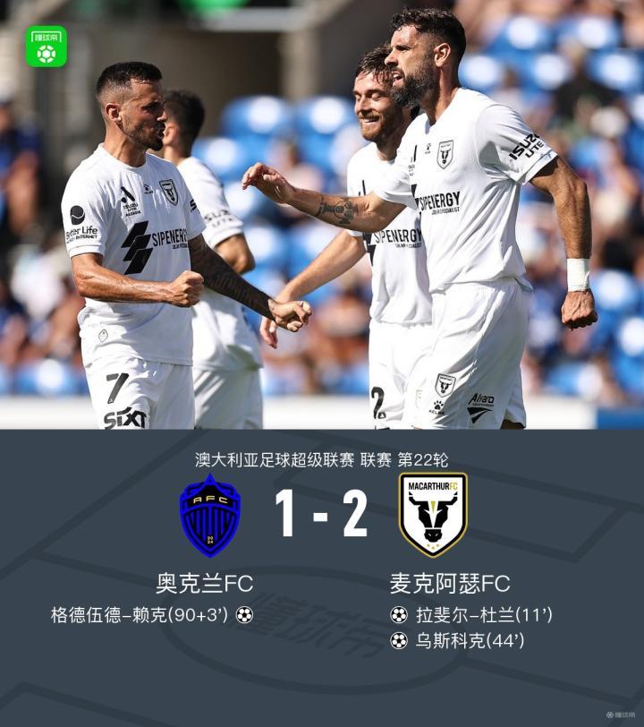 北京时间3月21日澳大利亚足球超级联赛第22轮,奥克兰FC主场对阵麦克阿瑟FC。比赛中,麦克阿瑟FC球员先通过配合由拉斐尔-杜兰打入一球,随后又通过配合由乌斯科克打入一球;下半场补时阶段,奥克兰FC球员通过配合由格德伍德-赖克打入一球。最终比分奥克兰FC 1-2 麦克阿瑟FC。