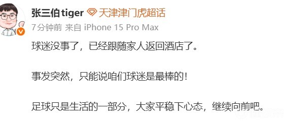 天津津门虎远征球迷在观赛时晕倒,现已在医院报平安我是开封菜 @懂球帝03-21 18:29北京时间3月21日,中超第3轮,天津津门虎客场0-3不敌辽宁铁人。比赛中有津门虎远征球迷晕倒并被救护车送至医院,不久后博主张三伯为晕倒球迷发文报了平安。比赛中,据津门虎博主“解说苏克”消息,远征看台球迷晕倒,癫痫,现已上救护车送往医院,上车的时候人有意识。不久后,博主张三伯发文为晕倒的球迷报平安:人没事,大家放心。展开更多