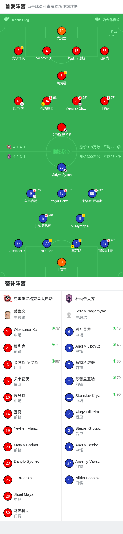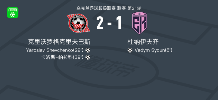 北京时间3月21日乌克兰足球超级联赛 联赛 第21轮,克里沃罗格克里夫巴斯主场对阵杜纳伊夫齐。克里沃罗格克里夫巴斯Yaroslav Shevchenko破门,卡洛斯-帕拉科破门。杜纳伊夫齐Vadym Sydun破门。最终比分克里沃罗格克里夫巴斯 2-1 杜纳伊夫齐。