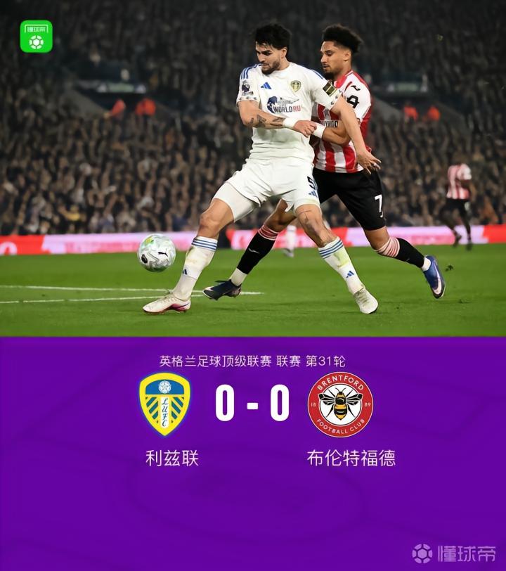 北京时间3月22日英格兰足球顶级联赛 联赛 第31轮,利兹联主场对阵布伦特福德。全场比赛沉闷,两队都没有明显的分机会,布伦特福德仅2射正。全场比赛结束。利兹联0-0闷平小蜜蜂,利兹联已经连续4场英超联赛被零封。
