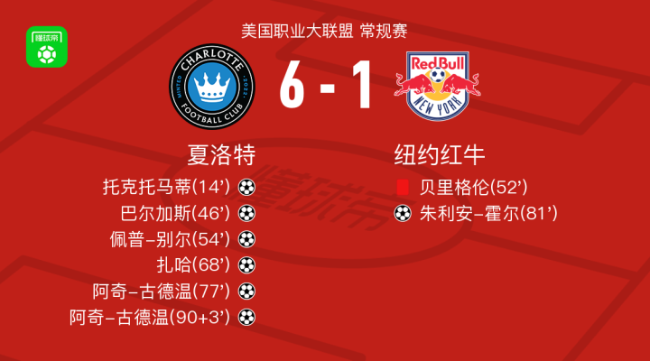 北京时间3月22日美国职业大联盟 常规赛,夏洛特主场对阵纽约红牛。夏洛特托克托马蒂破门,巴尔加斯破门,佩普-别尔破门,扎哈破门,阿奇-古德温梅开二度。纽约红牛朱利安-霍尔破门。最终比分夏洛特 6-1 纽约红牛。