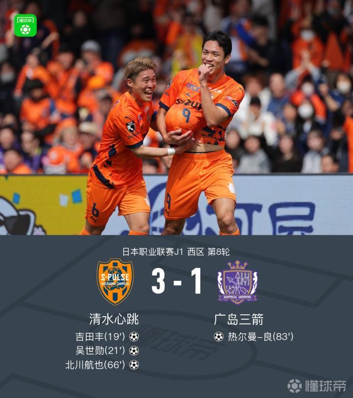北京时间3月22日日本职业联赛J1 西区 第8轮,清水心跳主场对阵广岛三箭。清水心跳吉田丰破门,吴世勋破门,北川航也破门。广岛三箭热尔曼-良破门。最终比分清水心跳 3-1 广岛三箭。