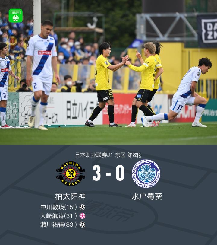 北京时间3月22日日本职业联赛J1 东区 第8轮,柏太阳神主场对阵水户蜀葵。柏太阳神中川敦瑛破门,濑川祐辅破门。水户蜀葵大崎航诗自摆乌龙。最终比分柏太阳神 3-0 水户蜀葵。