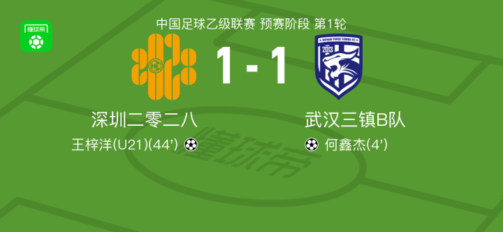 北京时间3月22日中国足球乙级联赛 预赛阶段 第1轮,深圳二零二八主场对阵武汉三镇B队。深圳二零二八王梓洋破门。武汉三镇B队何鑫杰破门。最终比分深圳二零二八 1-1 武汉三镇B队。