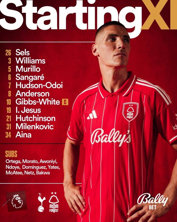 诺丁汉森林首发:26-泽尔斯、3-威廉斯、5-穆里略、31-米伦科维奇、34-埃纳、8-安德森、6-桑加雷、7-奥多伊、10-怀特、21-哈钦森、19-热苏斯