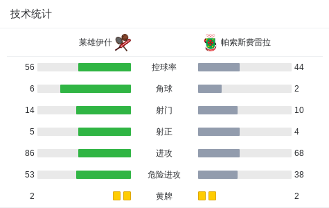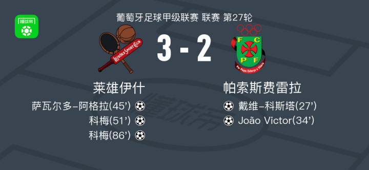 北京时间3月22日葡萄牙足球甲级联赛 联赛 第27轮,莱雄伊什主场对阵帕索斯费雷拉。莱雄伊什萨瓦尔多-阿格拉破门,科梅梅开二度。帕索斯费雷拉戴维-科斯塔破门,João Victor破门。最终比分莱雄伊什 3-2 帕索斯费雷拉。