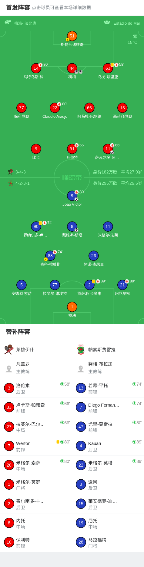 莱雄伊什3-2逆转帕索斯费雷拉,科梅两球,萨瓦尔多-阿格拉破门