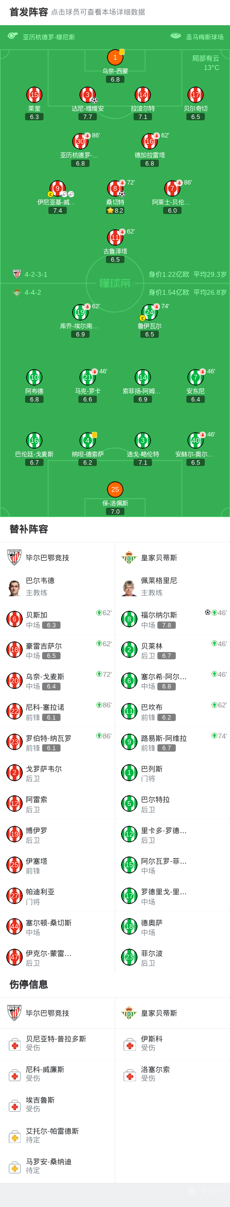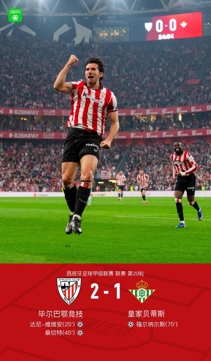 北京时间3月23日西班牙足球甲级联赛 第29轮,毕尔巴鄂竞技主场对阵皇家贝蒂斯。上半场达尼-维维安破门帮助主队取得领先,桑切特破门扩大比分。下半场福尔纳尔斯破门扳回一球。最终比分毕尔巴鄂竞技 2-1 皇家贝蒂斯。