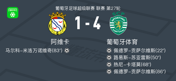 北京时间3月23日葡萄牙足球超级联赛 联赛 第27轮,阿维卡主场对阵葡萄牙体育。阿维卡马尔科-米洛万诺维奇破门。葡萄牙体育佩德罗-贡萨尔维斯梅开二度,路易斯-苏亚雷斯破门,热尼-卡塔莫破门。最终比分阿维卡 1-4 葡萄牙体育。