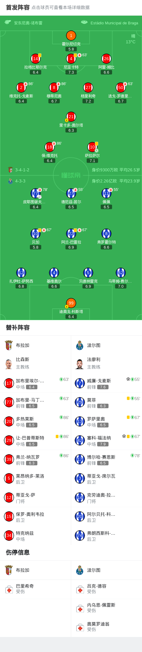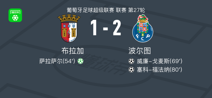 北京时间3月23日葡萄牙足球超级联赛 联赛 第27轮,布拉加主场对阵波尔图。布拉加萨拉萨尔破门。波尔图威廉-戈麦斯破门,塞科-福法纳破门。最终比分布拉加 1-2 波尔图。