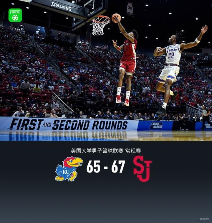 北京时间3月23日美国大学男子篮球联赛 常规赛,堪萨斯大学对阵圣约翰大学。半场堪萨斯大学26-34圣约翰大学,最终堪萨斯大学65-67圣约翰大学。