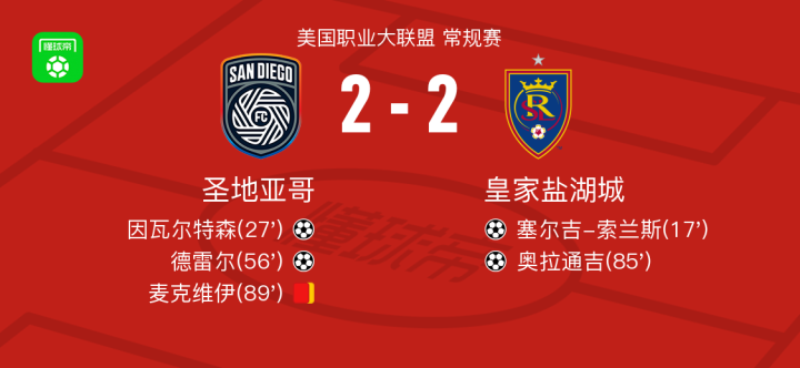 北京时间3月23日美国职业大联盟 常规赛,圣地亚哥主场对阵皇家盐湖城。圣地亚哥因瓦尔特森破门,德雷尔破门。皇家盐湖城塞尔吉-索兰斯破门,奥拉通吉破门。最终比分圣地亚哥 2-2 皇家盐湖城。