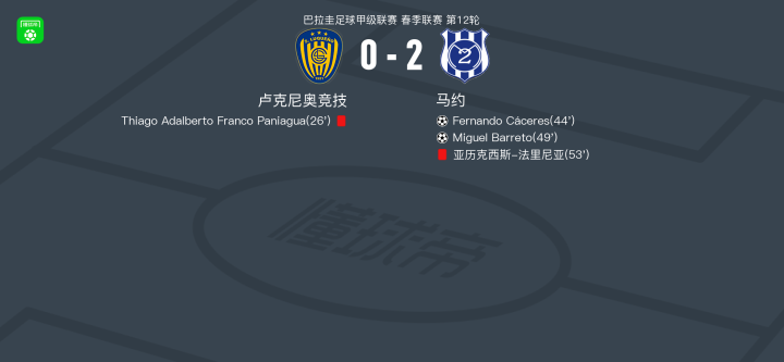 北京时间3月23日巴拉圭足球甲级联赛 春季联赛 第12轮,卢克尼奥竞技主场对阵马约。马约Fernando Cáceres破门,Miguel Barreto破门。最终比分卢克尼奥竞技 0-2 马约。