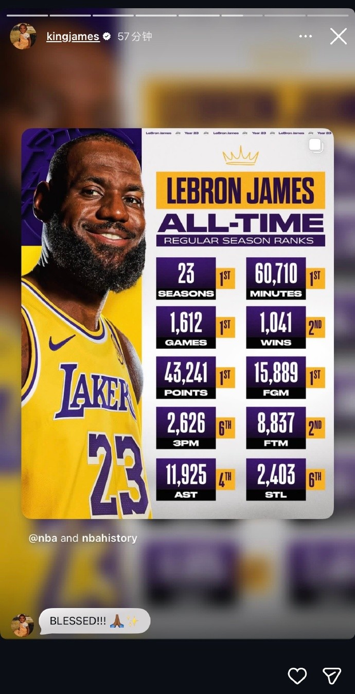 北京时间3月23日,詹姆斯更新社媒即时动态,转发了NBA官方发布的关于他生涯历史纪录的帖子,并配文:“心怀感恩🙏🏾”