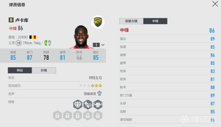 FIFA OL4中有三位高中锋值得我们关注,第一位就是来自曼联的“小魔兽”卢卡库,不仅在游戏中地位颇高,在现实中也是炙手可热的当家球星。B卡卢卡库拥有出色的大模型,190身高,96公斤,而且还有85的综合速度及快速带球的超级隐藏,高速起步还有身体优势,这样的球员在哪都是破密集防守的利器。双红会中第一粒进球正式来自于卢卡库的头球摆渡,在这次争顶中洛夫伦并没有对其构成威胁,而补位的张伯伦也没有到位,导致了第一个丢球;第二粒丢球同样与卢卡库分不开关系,拿球后的高速起步,让本就不擅长回追的洛夫伦再次吃了亏,制造的混乱也成功帮助拉什福德梅开二度。这就是一个中锋即使在远离禁区的位置依旧能够起到的作用。