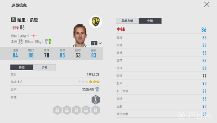 第二位我们就要说说热刺的哈里-凯恩,B卡有着188身高,86公斤,84的综合速度,并且远射有90的评分。在面对密集防守下,凯恩提供了第二个解决办法,就是远射,穿越人群的爆射是解决密集防守的有效手段。凯恩最大的特点就是抢点能力出色,在伯恩茅茨的比赛抢点打进一球但是被判无效,随后因伤遗憾退场。